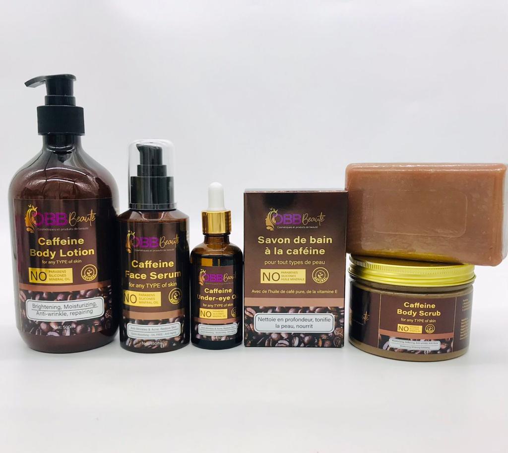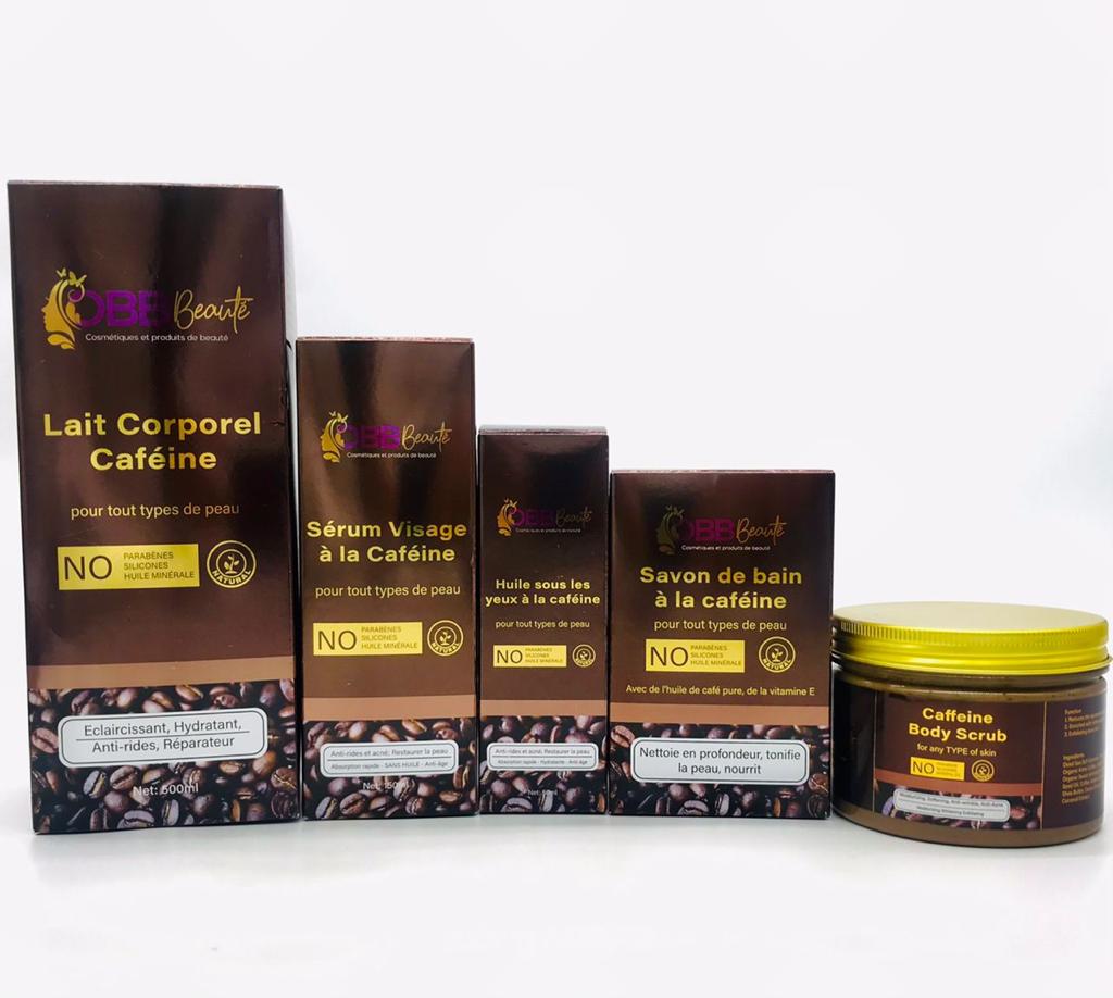 Gamme obbbeaute à la caféine, lait, savon, gommage, huile contre les cernes, sérum visage
