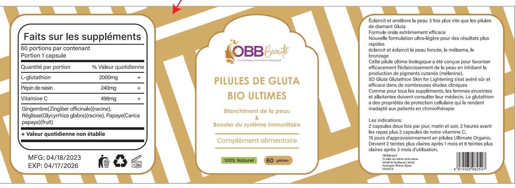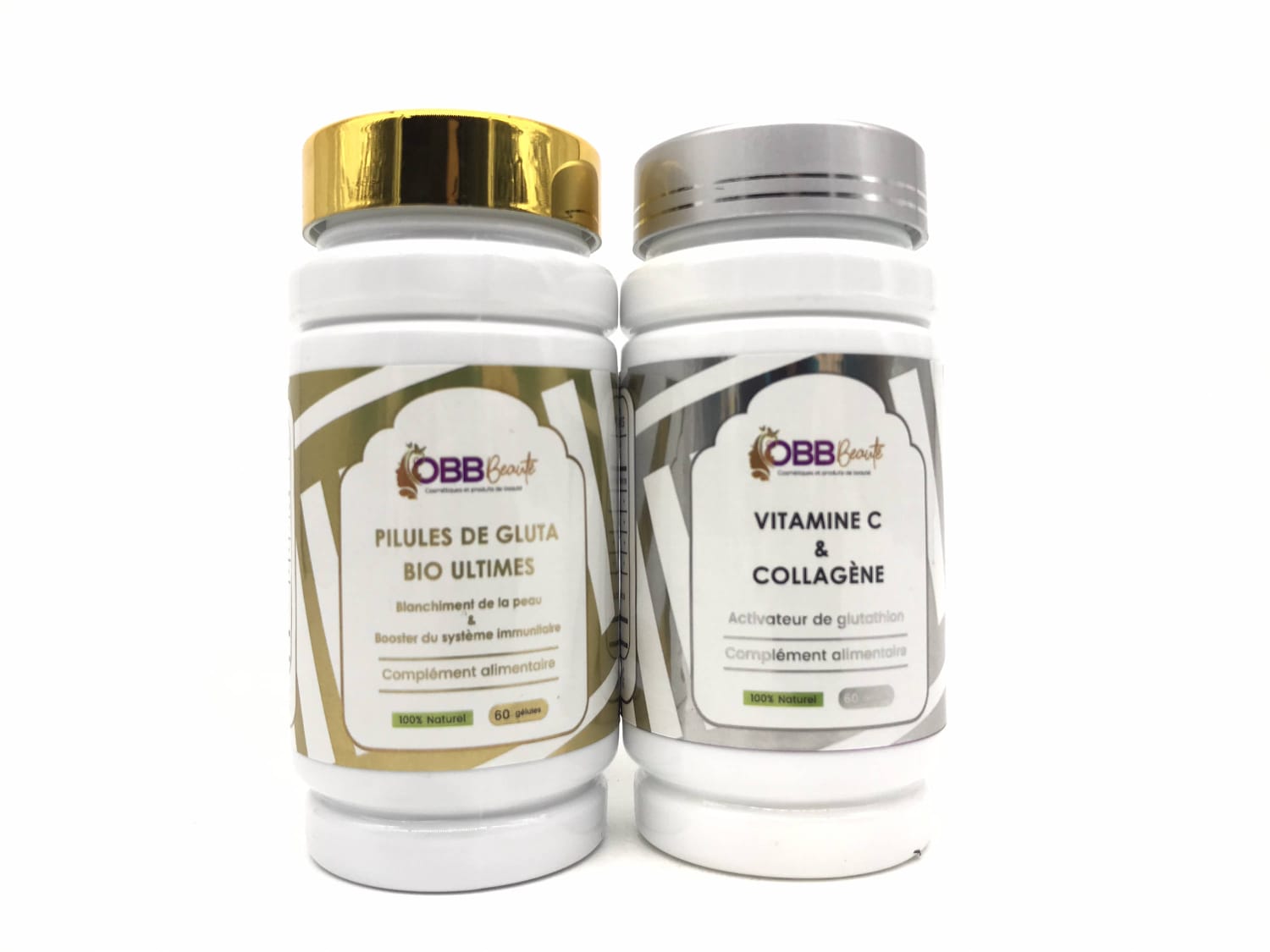 1. Pilules de Gluta Bio Ultimes Obbbeauté : Ces pilules sont formulées pour aider à éclaircir la peau de l'intérieur en agissant comme un complément nutritionnel pour favoriser un teint plus lumineux et uniforme.
